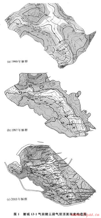 表1是1990年、1997年和2003年解釋的陵三段氣層頂(T62)、底(T70)構(gòu)造要素對(duì)比表。這幾次解釋的構(gòu)造走向均為北西 南東向(圖1),然而解釋的氣層頂面構(gòu)造圈閉面積、構(gòu)造幅度和最低圈閉線均有一定程度的變化,但在BP01資料基礎(chǔ)上研究得到的構(gòu)造圖在實(shí)鉆井深度、橫向壓力變化和氣水界面等方面均與實(shí)際資料最為吻合。