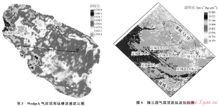 理論計(jì)算、正演模擬和實(shí)際道集分析均表明崖城13-1氣田陵三段氣層具有Ⅳ類AV0特征,那么三亞組和陵三段氣層周邊的勘探目標(biāo)是否也屬Ⅳ類AVO特征呢?三亞組的WedgeA砂體在2000年之前只有崖城13-1-4井鉆遇,鉆遇的地層厚度為111.3m,但氣層厚度只有6m,且物性較差,滲透率只有14mD,之前的地質(zhì)研究成果認(rèn)為該砂體的開發(fā)潛力不大。但是該砂體在地震資料上反射特征清楚,通過(guò)對(duì)比追蹤、AV0分析和疊前AV0反演認(rèn)為該砂體具有與陵三段氣層相同的Ⅳ類AVO特征(圖4),從反演得到的WedgeA頂面縱橫波速度比分布圖(圖5)可以看出崖城13-1-4井鉆遇了WedgeA砂體的邊部,相對(duì)整個(gè)砂體來(lái)說(shuō)崖城13-1-4井位置物性較差,而該砂體東部物性變好、含氣性特征更明顯、厚度也變大,通過(guò)崖城13-1-4井層速度預(yù)測(cè)砂體A8井處氣層厚度在50m以上,基于上述的地震預(yù)測(cè)結(jié)果決定鉆探A8井。于2000年在崖城13-1-4井東邊鉆探了A8井,在該砂體鉆遇氣層厚度達(dá)65.2m,滲透率高達(dá)1600mD、日產(chǎn)氣150×104m3,是目前該氣田產(chǎn)量最高的井之一,從而證實(shí)了鉆前的地震預(yù)測(cè)結(jié)果。