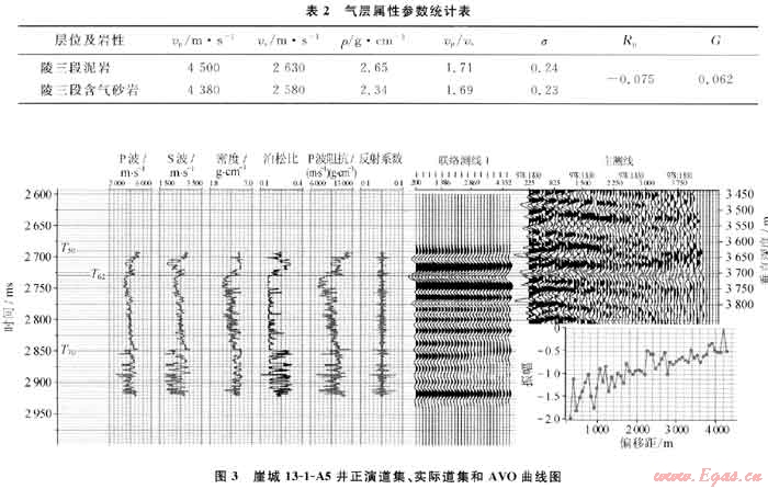 為了確定崖城13-1氣田陵三段的AV0類型,首先從理論出發(fā)統(tǒng)計(jì)了井上的氣層及上覆地層的屬性參數(shù),包括縱橫波速度、密度、泊松比等參數(shù),并通過(guò)Shuey’s的簡(jiǎn)化Zoeppritz方程計(jì)算了反射系數(shù),發(fā)現(xiàn)氣層頂面的反射系數(shù)大,而泊松比變化較小(表2),滿足產(chǎn)生第Ⅳ類異常的條件;接著選擇代表性的井(A5井)進(jìn)行了正演模擬,模擬結(jié)果顯示該井正演道集的氣層頂面均對(duì)應(yīng)波谷(負(fù)反射系數(shù)),并且隨著偏移距的增加振幅有減弱的跡象;隨后對(duì)實(shí)際的地震道集進(jìn)行了AV0分析(圖3),從實(shí)際道集中提取的氣層頂面AV0曲線表明:在偏移距200~4500m的變化范圍內(nèi),反射系數(shù)均為負(fù)值,并且其絕對(duì)值隨著偏移距的增多而減小,證實(shí)了該氣藏的Ⅳ類AV0特征。另外,在沒有鉆井的地方也對(duì)實(shí)際地震道集進(jìn)行了AV0分析,均顯示為Ⅳ類AV0特征。
