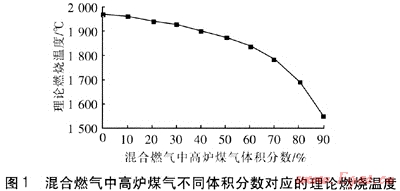 對于混合燃氣中高爐煤氣體積分數(shù)從0~90%的變化,高爐煤氣不同體積分數(shù)對應(yīng)的混合燃氣理論燃燒溫度見圖1。