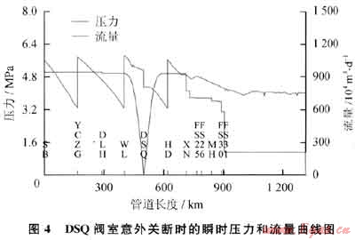 輸氣管道干線截斷閥(DSQ閥室)意外關(guān)斷時,管道的瞬時壓力和流量趨勢如圖4所示。從圖4可以看出,DSQ閥室意外關(guān)斷后,該閥室的天然氣通過量瞬間下降至零,上下游的流量下降均較快,入站壓力上升,出站壓力下降。長此以往將影響到上游壓縮機的運行、下游用戶的分輸量以及全線的輸氣量,最后導(dǎo)致全線停運。