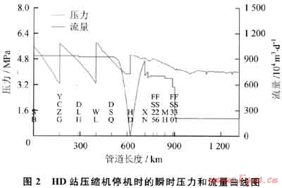 HD站壓縮機停機的瞬時壓力和流量趨勢如圖2所示。從圖2可以看出,HD站壓縮機停機后。該站的天然氣通過量瞬間下降至0,上下游的流量下降均下降較快,入站壓力上升,出站壓力下降。長此以往將影響到上游壓縮機的運行、下游用戶的分輸量以及全線的輸氣量。