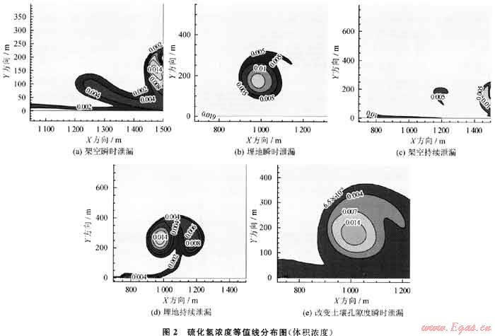 圖2為泄漏80s后硫化氫濃度分布。對(duì)比圖1、2可知,硫化氫濃度等值線分布形狀幾乎與甲烷濃度分布相同。這是由于甲烷和硫化氫出泄漏口時(shí)均勻混合,在擴(kuò)散過(guò)程中受到的影響因素相同,等值線分布重合。