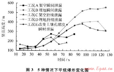 3) 管道泄漏爆炸范圍:埋地管道(工況B、D、E)泄漏爆炸范圍大且影響時(shí)間長(zhǎng),呈指數(shù)增加達(dá)到一定高度后不再升高,隨氣體擴(kuò)散濃度減低至爆炸下限外;架空瞬間及持續(xù)泄漏爆炸范圍在85s前增加且高度比埋地管道泄漏高,85s后降低;孔隙度越大其影響范圍越小。