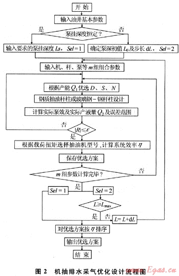 根據(jù)排水采氣井的地質(zhì)資料、生產(chǎn)數(shù)據(jù)、測井資料等數(shù)據(jù),在目前較為成熟的理論研究成果的基礎上,通過進一步對機抽井的理論研究工作,研制出了“機抽排水采氣系統(tǒng)優(yōu)化設計軟件”。該軟件分為機抽井校核、機抽井設計、轉(zhuǎn)抽井設計、機抽井管理、機抽井診斷、實測系統(tǒng)效率計算、軟件幫助7大子系統(tǒng)[4~5]。應用該軟件,在供排協(xié)調(diào)條件下對機一桿一泵系統(tǒng)進行優(yōu)化設計與參數(shù)、設備等的優(yōu)選,其優(yōu)化設計流程如圖2所示。