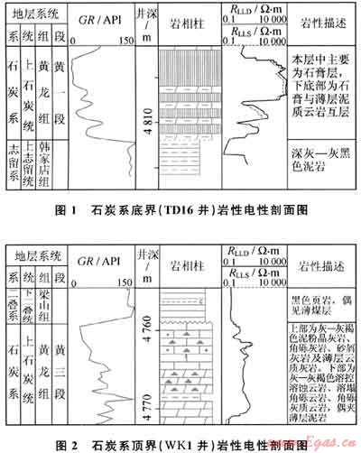 二疊系與石炭系在巖性及電測曲線上均易于劃分。其上下地層的巖性和電性差異較為明顯。從巖性上看,梁山組底部以黑色頁巖夾薄煤層,局部頁巖含硅質(zhì),與下伏C2hl灰褐色泥粉晶灰?guī)r呈角度不整合接觸。從電性上看,梁山組對應的測井曲線反映為GR值較高,RLLD和RLLS值較低(圖2)。