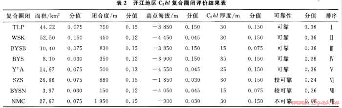 C2hl及其上、下巖層的組合是四川盆地多套生、儲蓋組合中較好的一套組合,經(jīng)過多年的勘探也證實C2hl具有豐富的天然氣資源。結(jié)合已發(fā)現(xiàn)C2hl氣藏特征對已識別C2hl復合圈閉面積進行劃分,圈閉面積小于10km2的權(quán)值取0.2,圈閉面積大于50km2的取權(quán)值1.0,圈閉面積介于10~50km2的取權(quán)值0.5,圈閉面積評價系數(shù)權(quán)重為O.15(表1)。