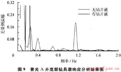 從圖9可以看出,普光A井底部鉆具組合在0.2Hz和1.1Hz的頻率下,產(chǎn)生了很大的位移響應(yīng),即在轉(zhuǎn)速為12r/min和66r/min時,鉆柱很容易產(chǎn)生較大的橫向共振,使鉆柱內(nèi)部產(chǎn)生很大的交變應(yīng)力。而使用鉆井液時鉆柱只在頻率為0.14Hz時產(chǎn)生很大位移響應(yīng),對應(yīng)的轉(zhuǎn)速為8.4r/min,遠遠小于常用轉(zhuǎn)速,不會對鉆柱產(chǎn)生實質(zhì)性危害。普光A井在空氣鉆井時采用了65r/min的轉(zhuǎn)速,外部激勵頻率與使鉆柱產(chǎn)生最大位移響應(yīng)的固有頻率非常接近,極易發(fā)生鉆柱的橫向共振,在鉆進過程中,出現(xiàn)了3次鉆柱斷裂事故,理論計算與現(xiàn)場結(jié)果吻合。