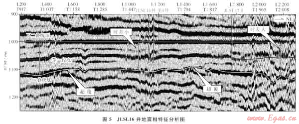 本次預(yù)測(cè)成果經(jīng)JLSL16井實(shí)鉆證實(shí),在茅口組獲氣,從平面成果圖分析,JLSL16井應(yīng)與龍4井具有相似的沉積環(huán)境。圖5為過(guò)JLSL16井下二疊統(tǒng)頂層拉平地震剖面(該測(cè)線為圖4中測(cè)線B),圖中3種不同的地震相特均表明JLSL16井在茅三時(shí)期該區(qū)域?yàn)闉┫鄡?chǔ)層發(fā)育有利區(qū),預(yù)測(cè)成果與實(shí)鉆結(jié)果吻合。