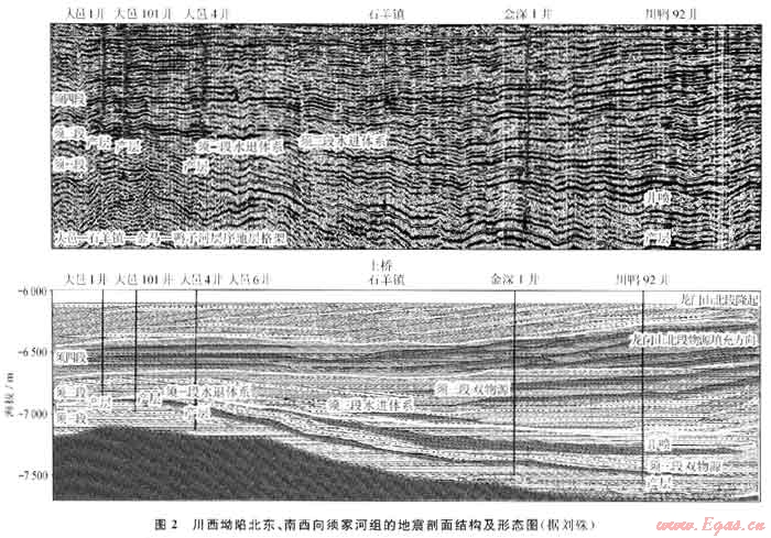據(jù)龍門山前緣坳陷內(nèi)的地震測線,在T52轉(zhuǎn)換面上、下,存在兩種不同的反射波組和盆地結(jié)構(gòu),須上盆由NE→SW前積,須下盆由SW→NE前積,表征了坳陷內(nèi)物源分別來自米倉山、大巴山與康滇古陸,沉積中心在彭州鴨子河一帶,相帶展布見圖2。