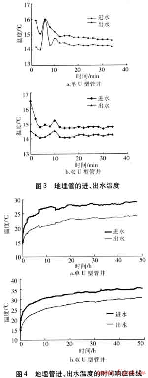 對(duì)單U型管井和雙U型管井均進(jìn)行了熱響應(yīng)測(cè)試。測(cè)試時(shí)保持每口井的加熱功率和供水流量穩(wěn)定,分別記錄48h的進(jìn)、出水溫度。進(jìn)、出水溫度的時(shí)間響應(yīng)曲線見圖4。由圖4可知,經(jīng)過(guò)一段時(shí)間后,地埋管的進(jìn)、出水溫差基本穩(wěn)定,表明地下?lián)Q熱已基本達(dá)到了平衡。此時(shí)計(jì)算得單、雙U型管的平均換熱量分別為47.59、86.44W/m。
