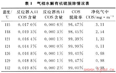 1) 應(yīng)用氣相水解法脫除有機硫工藝,可以有效脫除原料氣中的COS,凈化氣中COS<70mg/m。
