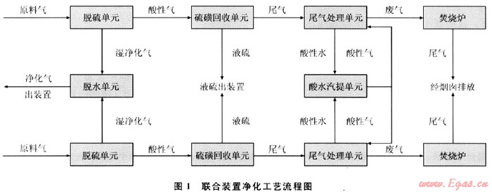 高含硫原料氣經(jīng)過脫硫單元脫除幾乎所有的H2S、部分有機硫及C02,再經(jīng)過脫水單元脫水后,合格凈化氣出裝置外輸。脫硫單元產(chǎn)生的含有H2S的酸性氣體進入硫磺回收單元,將硫元素回收為液硫,送出裝置,經(jīng)成型后運至硫磺儲運系統(tǒng)并外銷。硫磺回收單元的尾氣經(jīng)過尾氣處理單元凈化處理,凈化后的尾氣送至尾氣焚燒爐焚燒后,產(chǎn)生的煙氣能滿足國家環(huán)保要求,經(jīng)煙囪排入大氣;產(chǎn)生的酸性水送至酸性水汽提單元,汽提出的。酸性氣體送至尾氣處理單元凈化處理,而處理后合格的凈化水則送至循環(huán)水廠循環(huán)使用。