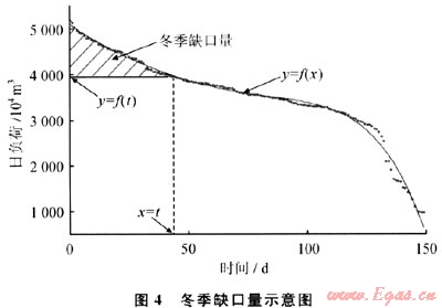 式中Qt為冬季缺口氣量,104m3;f(t)=qmax為上游供氣管網(wǎng)的最大日負(fù)荷,104m3,也就是直線x=t和曲線y=f(x)交點(diǎn)的縱坐標(biāo)值。