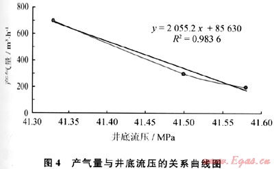 地層壓力是確定欠平衡狀態(tài)的另一個重要參數(shù)。欠平衡鉆井過程中,井底處于欠平衡狀態(tài),地層流體在儲層壓力的驅(qū)動下流入井筒,其與井筒循環(huán)介質(zhì)混合后,流到地面。不同欠壓值對應(yīng)不同的地層流體產(chǎn)出量[10~12]。當井底流動壓力與地層壓力相等時,儲層沒有流體產(chǎn)出。因此可以實時監(jiān)測地層的產(chǎn)氣量,通過改變現(xiàn)場的鉆井液排量及注氣量,得到不同井底壓力條件下的穩(wěn)定產(chǎn)氣量,取得3組產(chǎn)氣量與井底循環(huán)當量壓力數(shù)據(jù),并繪制于“產(chǎn)氣量 井底動壓”坐標內(nèi),回歸三點的直線與井底動壓坐標的交點即地層壓力。