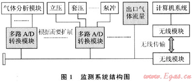 該系統(tǒng)采用分布式信號采集、集中式數(shù)據(jù)計算處理體系結(jié)構(gòu),如圖1所示。系統(tǒng)中大部分傳感器都是模擬量信號輸出,包括氣體組分、濃度、泵沖、立壓、套壓等傳感器,通過組合式多路A/D轉(zhuǎn)換模塊對其進行遠程實時信號采集處理和控制。其他以數(shù)字信號輸出的傳感器則直接連接A/D轉(zhuǎn)換模塊的輸出總線并與主計算機系統(tǒng)進行數(shù)字化信號傳輸。A/D轉(zhuǎn)換模塊輸出的總線信號通過無線收發(fā)模塊與主計算機系統(tǒng)進行無線傳輸,減輕了在復(fù)雜的井場環(huán)境中布線的工作量。根據(jù)實際情況,系統(tǒng)可以增加A/D模塊和各種不同類型的傳感器來滿足測量與監(jiān)控的需要。