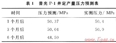 同時(shí)在資料解釋后按定產(chǎn)量的方式進(jìn)行預(yù)測(cè)。保持產(chǎn)量在47.9×104m3/d不變的情況下,生產(chǎn)1個(gè)月、3個(gè)月、6個(gè)月后進(jìn)行壓力預(yù)測(cè),井底壓力分別下降至50.37MPa、50.04MPa、48.50MPa,與生產(chǎn)后實(shí)測(cè)壓力基本吻合,其預(yù)測(cè)結(jié)果見(jiàn)表1。
