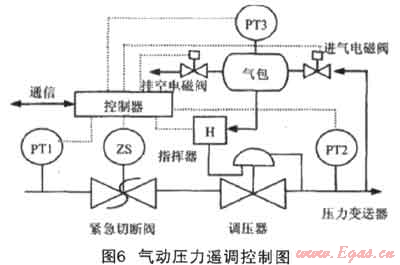 CS壓力遙調(diào)通過導(dǎo)壓管引入外部壓力,通過控制一個(gè)氣包的進(jìn)、出口電磁閥來調(diào)節(jié)氣包內(nèi)的壓力,進(jìn)而可以控制指揮器噴嘴噴出的燃?xì)鈮毫Γ罱K控制調(diào)壓器的出口壓力,如圖6[2]。