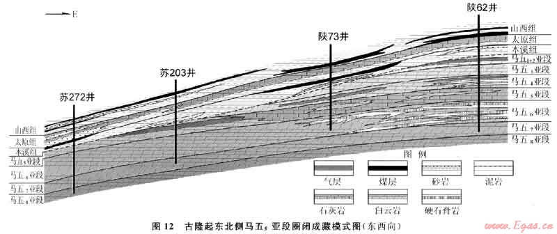 構(gòu)造翻轉(zhuǎn)后對靖西地區(qū)奧陶系中、下組合的天然氣成藏產(chǎn)生了2個(gè)方面的重要影響:①馬五5區(qū)域巖性相變的致密石灰?guī)r一側(cè)正處于構(gòu)造的上傾方向,從而對其西側(cè)的白云巖儲(chǔ)集體構(gòu)成了有效的巖性遮擋條件(圖12);②由于東側(cè)上傾,使得上古生界煤系烴源巖層與下古生界白云巖儲(chǔ)層在風(fēng)化殼界面附近由原來的上下接觸關(guān)系變成一定程度的側(cè)向(或左右)甚至“源下儲(chǔ)上”的接觸關(guān)系,從而更有利于烴類氣體在白云巖儲(chǔ)集體中的充注成藏。