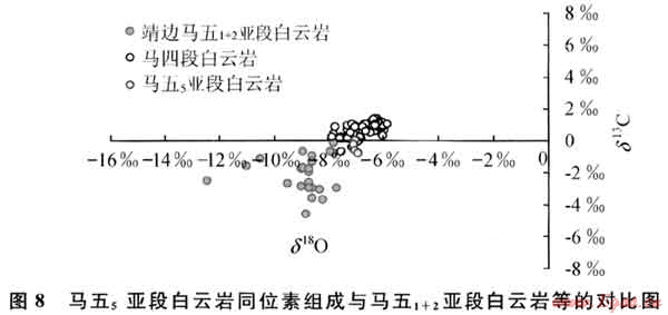 5) 大氣淡水與“富鎂鹵水”混合的白云巖化模式:由于大氣淡水的參與,在古隆起東側(cè)地區(qū)的馬五5沉積層中形成大氣淡水與“富鎂鹵水”的混合水帶,這種成巖介質(zhì)環(huán)境對馬五5的白云巖化作用也會(huì)產(chǎn)生顯著的影響,主要表現(xiàn)在2個(gè)方面:①稀釋了“富鎂鹵水”,使成巖流體濃度降低,進(jìn)而減少白云石結(jié)晶時(shí)的結(jié)晶中心形成總數(shù)(晶核形成數(shù)),這會(huì)使白云石生長更趨緩慢,結(jié)晶更趨自形、粗大;②使先成白云石重結(jié)晶。據(jù)Clyde Moore的研究認(rèn)為[13],大氣淡水的參與會(huì)使先成白云石重結(jié)晶,并使其地球化學(xué)特征發(fā)生重組,這也會(huì)導(dǎo)致其晶體結(jié)構(gòu)變粗和白云石自形程度的提高。對盆地古隆起東側(cè)馬五5白云巖的地球化學(xué)分析結(jié)果表明:馬五5白云巖有序度一般為0.85~0.95,尤其是其C—0同位素特征(δ13C:-0.79‰~0.07‰;δ18O:-7.1‰~-6.9‰),的確與馬五1+2蒸發(fā)潮坪形成的泥粉晶白云巖存在較大的差異(圖8)。