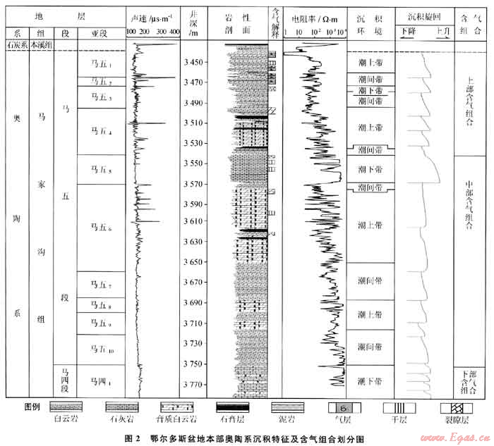 近期勘探研究者將盆地本部的奧陶系劃分為3個(gè)含氣組合(圖2):馬五1-馬五4為上部含氣組合(簡稱上組合),儲(chǔ)層主要為風(fēng)化殼溶孔儲(chǔ)層,圈閉類型以古地貌型地層圈閉為主;馬五5-馬五10為中部含氣組合(簡稱中組合),儲(chǔ)層主要為白云巖晶間孔儲(chǔ)層,圈閉類型以巖性圈閉為主;馬四段及其以下為下部含氣組合(簡稱下組合),儲(chǔ)層主要為白云巖晶間孔儲(chǔ)層,圈閉條件與中組合相近似。