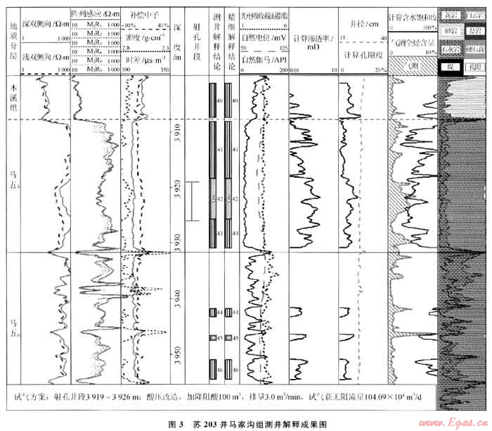 在上述認(rèn)識(shí)的指導(dǎo)下,2009—2010年在蘇里格地區(qū)上古生界砂巖氣藏的勘探中,繼續(xù)堅(jiān)持兼探下古生界,圍繞古隆起東側(cè)的中組合領(lǐng)域終于在蘇203井和蘇322井的鉆探中取得了重大的突破:蘇203井在馬五5鉆遇較好的白云巖晶間孔儲(chǔ)層,含氣顯示良好,測井解釋氣層厚度為7.4m,試氣獲得104.0882×104m3/d的高產(chǎn)氣流(圖3);蘇322井馬五6鉆遇白云巖儲(chǔ)層,測井解釋氣層厚度為3.8m,試氣獲得41.5904×104m3/d的高產(chǎn)氣流。隨后的研究證實(shí),馬五5含氣層段為白云巖晶間孔型儲(chǔ)層,明顯不同于靖邊地區(qū)馬五1+2的風(fēng)化殼溶孔型儲(chǔ)層,圈閉成藏特征也與靖邊地區(qū)的風(fēng)化殼氣藏存在較大差異,從而展開了對古隆起東側(cè)地區(qū)中組合沉積及成藏規(guī)律的綜合研究,形成了古隆起東側(cè)地區(qū)中組合存在區(qū)域性巖性圈閉成藏有利區(qū)帶的新認(rèn)識(shí),奠定了中組合規(guī)??碧桨l(fā)現(xiàn)的基礎(chǔ)。近期鉆探的蘇345井在馬五5試氣又獲得225.44×104m3/d的高產(chǎn)工業(yè)氣流,目前已落實(shí)烏審召、烏審旗、安邊、吳起4個(gè)中組合成藏含氣富集區(qū),初步估算天然氣儲(chǔ)量規(guī)模超過1000×108m3。