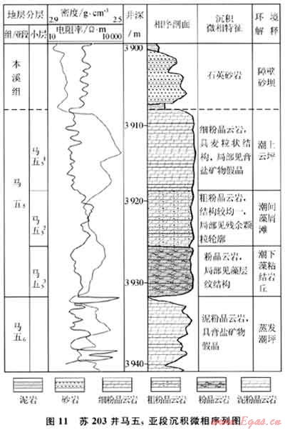 其次,從大的巖性帶內(nèi)部來看,也存在次一級(jí)的巖性變化(即沉積微相類型的變化)。按照Walther相律的原理[16],在連續(xù)發(fā)育的地層序列中,縱向上連續(xù)的沉積必然在橫向上相鄰,因此通過對蘇203井等馬五5沉積微相序列的分析(圖11),就可以初步確定馬五5地層在鄰近區(qū)域橫向相鄰的微相變化規(guī)律,蘇203井區(qū)馬五5主力儲(chǔ)層段發(fā)育在中部(馬五52)的藻屑灘相白云巖中,其下部(馬五53)的藻粘結(jié)巖丘白云巖和上部(馬五51)的潮上蒸發(fā)云坪白云巖,則分別代表了其東側(cè)和西側(cè)相鄰的微相環(huán)境,即在大的白云巖分布區(qū)帶內(nèi),可進(jìn)一步細(xì)分出顆粒灘及灘間低能環(huán)境的沉積類型。它們雖同為白云巖,但由于沉積微相環(huán)境及成巖作用特征不同,因而具有不同的物性特征,并進(jìn)而構(gòu)成次一級(jí)的巖性相變特征。