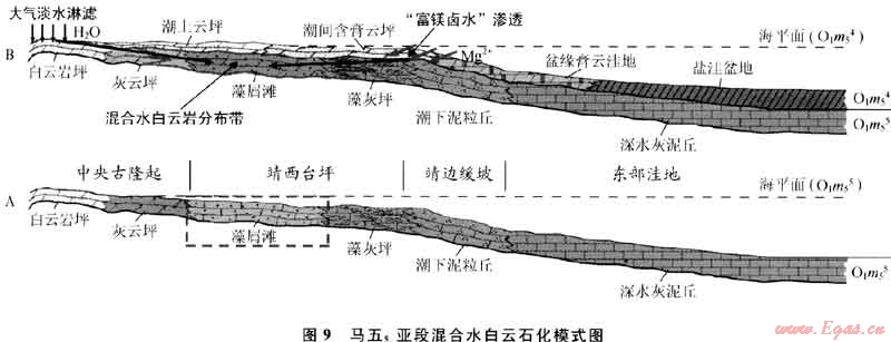 4) 大氣淡水的參與:在馬五5沉積后進(jìn)入馬五4沉積期時(shí),古隆起地區(qū)大部分時(shí)間處于間歇暴露的沉積環(huán)境,當(dāng)發(fā)生大氣降水時(shí),大面積的降水會(huì)在陸地上匯聚后向古隆起兩側(cè)地區(qū)下滲分散,當(dāng)其進(jìn)入古隆起東側(cè)先期沉積的馬五5沉積層中時(shí),也會(huì)對馬五5沉積起到一定的改造作用。淡水作用的直接效果是會(huì)導(dǎo)致碳酸鹽沉積物(尤其是文石及方解石等CaC03礦物)的部分溶解,其所產(chǎn)生的Ca2+離子也會(huì)對鄰近沉積區(qū)石膏的沉淀起到一定的促進(jìn)作用,從而進(jìn)一步推動(dòng)上述“石膏沉淀-白云石化交代”的地球化學(xué)循環(huán)過程。