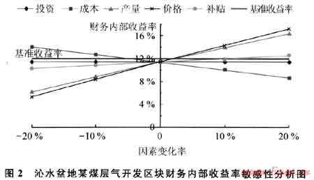 在計(jì)算期內(nèi),可能發(fā)生變化并影響項(xiàng)目盈利能力的主要因素有產(chǎn)量、投資、成本、產(chǎn)品銷售價(jià)格和補(bǔ)貼。根據(jù)沁水盆地某煤層氣區(qū)塊的各單項(xiàng)因素的變化對(duì)財(cái)務(wù)內(nèi)部收益率的影響進(jìn)行了敏感性分析,敏感性分析結(jié)果見圖2。從敏感性分析結(jié)果可以看出,財(cái)務(wù)內(nèi)部收益率對(duì)投資、氣價(jià)和產(chǎn)量較為敏感,其次是成本、補(bǔ)貼。