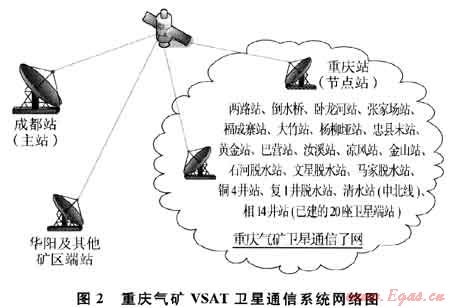 3) 對于新納入到重慶輸氣管網(wǎng)SCADA系統(tǒng)進(jìn)行監(jiān)控的站場(如地處偏遠(yuǎn)且公網(wǎng)難以到達(dá)的重要站場)采用VSAT衛(wèi)星系統(tǒng)數(shù)據(jù)傳輸電路作為重慶輸氣管網(wǎng)SCADA系統(tǒng)數(shù)據(jù)傳輸主通道,GPRS數(shù)據(jù)傳輸作為SCADA系統(tǒng)備用數(shù)據(jù)傳輸通道。重慶氣礦VSAT衛(wèi)星通信系統(tǒng)網(wǎng)絡(luò)圖如圖2所示。