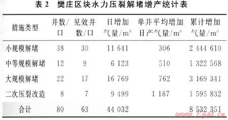 近兩年期間,在樊莊區(qū)塊共實(shí)施各類水力壓裂改造井80口,其中小規(guī)模解堵井38口,中等規(guī)模解堵井12口,大規(guī)模解堵井22口,二次重新壓裂井8口,日平均增加產(chǎn)氣量44032m3,單井日平均產(chǎn)氣量提高550m3以上,措施有效率達(dá)到78%(表2)。