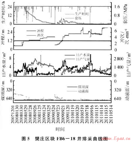 FB6-18井于2007年4月6日完鉆,完鉆井深763m。2007年7月10日壓裂3#煤層,壓裂井段702.8~707.5m,厚度4.7m,共注入活性水壓裂液460m3,石英砂40m3。2007年12月20日投產(chǎn),排采127d解吸見氣,最高日產(chǎn)氣量達(dá)到1555m3,產(chǎn)氣高峰時(shí)日產(chǎn)水3.5m3,維持242d后日產(chǎn)氣量迅速下降至696m3,水量1.5m3。判斷為作業(yè)導(dǎo)致煤粉堵塞,或氣鎖,導(dǎo)致難以高產(chǎn)。2009年6月4日進(jìn)行中等規(guī)模壓裂解堵,目前氣量700m3,日產(chǎn)水0.7m3。經(jīng)分析未見效的主要原因該井處于煤層斷層帶附近,煤體結(jié)構(gòu)破碎,煤層堵塞后,難以用壓裂方法解開地層堵塞,只有采取連續(xù)排采,平穩(wěn)降壓的方法,進(jìn)一步擴(kuò)大解吸范圍,提高產(chǎn)氣量,隨著排采時(shí)間的增長(zhǎng),該井產(chǎn)量開始緩慢上升(圖5)。