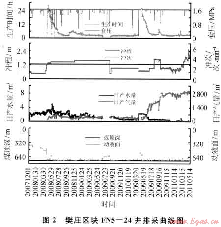 FN5-24井于2006年11月12日完鉆,完鉆井深783m。2007年4月14日壓裂3#煤層,壓裂井段721.6~727.5m,厚度5.9m,共注入活性水壓裂液551m3,石英砂45m3。2007年12月9日投產(chǎn),排采134d解吸見氣,最高日產(chǎn)氣量達(dá)到693m3,產(chǎn)氣高峰時(shí)日產(chǎn)水3.5m3,維持30d后日產(chǎn)氣量迅速下降至211m3,水量0.9m3。解吸初期套壓高,出現(xiàn)頻繁俜抽導(dǎo)致井底壓力波動(dòng),低產(chǎn)判斷為由于井底壓力反復(fù)波動(dòng)導(dǎo)致地層氣鎖,導(dǎo)致套壓、產(chǎn)氣量迅速下降(圖2)。2010年4月6日進(jìn)行中等規(guī)模壓裂解堵,措施后183d,產(chǎn)氣量增加至2683m3,截至目前已穩(wěn)產(chǎn)24d,累計(jì)增產(chǎn)氣40×104m3。