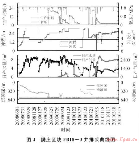 FB18-3井于2007年5月12日完鉆,完鉆井深650m。2008年6月6日壓裂3#煤層,壓裂井段587.9~592.5m,厚度4.6m,共注入清潔壓裂液246m3,石英砂30m3。2008年6月21日投產(chǎn),排采301d解吸見氣,最高日產(chǎn)氣量達(dá)到1226m3,產(chǎn)氣高峰時(shí)日產(chǎn)水16.2m3,維持30 d后產(chǎn)氣量迅速下降至87m3,水量11.5m3。判斷為首次壓裂效果差,導(dǎo)致見氣后套壓迅速下降,降壓范圍難以擴(kuò)展(圖4)。2010年3月27日進(jìn)行二次壓裂,措施后168d,產(chǎn)量增加至2632m3,目前已穩(wěn)產(chǎn)238d,累計(jì)增產(chǎn)氣59×104m3。