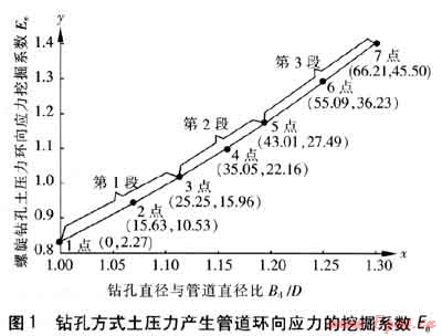 應(yīng)用上述曲線函數(shù)關(guān)系,通過VB軟件可編制出圖形查值軟件,仍以本應(yīng)用實(shí)例進(jìn)行說明。已知鉆孔直徑與管道直徑比Bd/D值(例如Bd/D=1.228),通過圖形對應(yīng)比例關(guān)系,軟件程序計算出與Bd/D值相對應(yīng)的x值。根據(jù)x值,軟件程序自動判定此x值所在曲線段數(shù),依據(jù)該段曲線函數(shù)關(guān)系式,求出相應(yīng)的y值。根據(jù)y值,依據(jù)圖形對應(yīng)比例關(guān)系,軟件程序計算出與其相對應(yīng)的螺旋鉆孔土壓力環(huán)向應(yīng)力挖掘系數(shù)Ee值(Ee=1.24)。