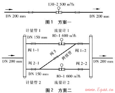圖1、2為某城市天然氣門站計量系統(tǒng)工藝管路方案一和方案二。兩個方案相比較,方案一結(jié)構(gòu)簡單,工程造價較低,方案二則相反。但是,采用兩管并聯(lián)的方案二,可以使整個計量系統(tǒng)的測量范圍從130~2500m3/h(量程比20:1)擴展到80~3200m3/h(量程比40:1)。在門站運行過程中,如果遇到流量波動較大時,方案二可以隨時打開或關(guān)閉兩臺流量計中的一臺,使流量計量儀表始終工作在0.2qmax到0.8qmax這一計量性能最優(yōu)的范圍段(qmax為最大流量),從而保證整個計量系統(tǒng)的計量性能最優(yōu)。另外在流量計1或流量計2中的某一臺出現(xiàn)故障或進行周期檢定時,可以使用單臺流量計供氣運行的方式,避免城市門站供氣中斷的情況發(fā)生。