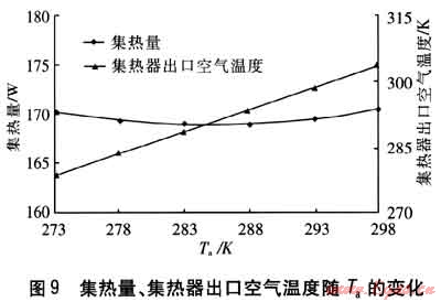 保持其他參數(shù)不變,集熱量、集熱器出口空氣溫度隨Ta的變化見圖9。由圖9可知,Ta增大,即集熱器進口空氣溫度增大,則集熱器出口空氣溫度相應升高。
