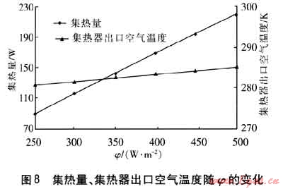 保持其他參數(shù)不變,集熱量、集熱器出口空氣溫度隨φ的變化見圖8。由圖8可知,隨著φ的增大,吸熱板溫度升高,與流道內空氣的溫差加大,對流傳熱增強,集熱器出口空氣溫度升高,集熱量也隨之升高。