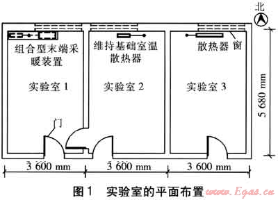 在天津市某高校3間尺寸均為3600mm×5680mm×3600mm(寬×進深×高)的實驗室中進行了實驗研究,3間實驗室的采暖裝置分別是組合型末端采暖裝置、維持基礎室溫的散熱器及滿足熱負荷要求的散熱器。實驗室的平面布置見圖1,圍護結構特性參數(shù)見表1。對散熱器、供暖型風機盤管、組合型末端采暖裝置3種采暖方式進行實驗研究。