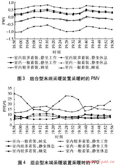 在實驗室1中,采用組合型末端采暖裝置進行采暖,開啟供暖型風機盤管的風機中檔后進行測試。當CLO=1.0時,當人員靜坐休息時,PMV的平均值為0.31,PPD的平均值為7.26%,滿足IS0 7730—2005對可接受熱環(huán)境的規(guī)定,即室內熱環(huán)境滿足大部分人的舒適要求。靜坐工作時,PMV的平均值為0.63,PPD的平均值為13.38%,人們需將較多著裝變?yōu)橐话阒b(CLO=0.7)。變?yōu)橐话阒b后,靜坐工作時PMV的平均值為0.28,PPD的平均值為6.87%;靜坐休息時PMV的平均值為-0.04,PPD的平均值為5.20%。此時靜坐工作和靜坐休息時的熱環(huán)境均符合IS0 7730—2005對可接受熱環(huán)境的規(guī)定??梢姴捎媒M合型末端采暖裝置采暖,既符合人們的日常行為習慣,又提升了人們的生活品質。通過對幾年實測數(shù)據(jù)的分析,建議采用組合型末端采暖裝置時,在進行維持基礎室溫所需的散熱器面積計算時,散熱器的散熱量宜取該房間室內采暖設計熱負荷的40%。組合型末端采暖裝置采暖時的PMV、PPD分別見圖3、4。