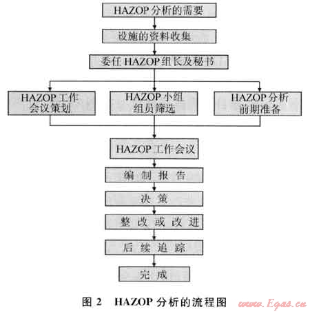 HAZOP需要將工藝圖或操作程序劃分為分析節(jié)點(diǎn)或者操作步驟,然后用引導(dǎo)詞找出過(guò)程的危險(xiǎn),識(shí)別出那些具有潛在危險(xiǎn)的偏差,并對(duì)偏差原因、后果及控制措施等進(jìn)行分析,圖2為HAZOP分析的流程圖[4~5]。
