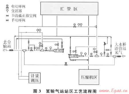 某輸氣站海拔3000m,占地面積逾3×104m2。此前該站僅為清管站,2007年增壓站投產(chǎn)運(yùn)行。站區(qū)分為綜合值班區(qū)、工藝裝置區(qū)、壓縮機(jī)組區(qū)和場(chǎng)外放空區(qū)。全站實(shí)現(xiàn)了場(chǎng)站自動(dòng)化控制,采用SCADA系統(tǒng)對(duì)工藝參數(shù)進(jìn)行采集和監(jiān)控。該站具備天然氣增壓、除塵過(guò)濾、數(shù)據(jù)采集和上傳、收發(fā)清管器、天然氣放空與泄壓、發(fā)電、供暖等功能,是一個(gè)標(biāo)準(zhǔn)化的壓縮機(jī)站場(chǎng)。站內(nèi)管線設(shè)計(jì)壓力6.3MPa。圖3為某輸氣站站區(qū)工藝流程圖。