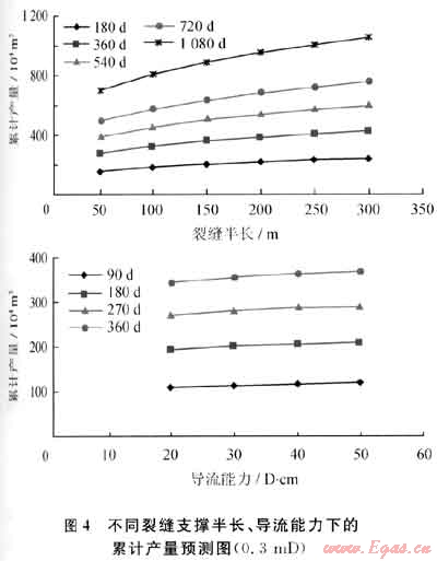 根據(jù)鄰井各氣層解釋結(jié)果,其有效滲透率主要分布于0.3~0.5mD,通過FracproPT軟件模擬,確定不同滲透率對應(yīng)的裂縫參數(shù):最優(yōu)裂縫長度為150~200m,最優(yōu)裂縫導(dǎo)流能力為30D·cm(圖3、4)。