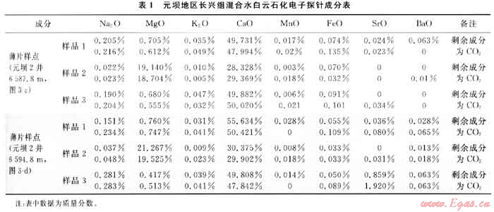 通過對比分析巴巴多斯群島更新世碳酸鹽巖混合水白云石化的情況(圖3~a,b)[5],發(fā)現(xiàn)元壩地區(qū)長興組生屑灰?guī)r混合水白云石化(圖3-c,d)與其有很大的相似性:①白云石膠結(jié)物的量較低并且分布不連續(xù);②白云石膠結(jié)物經(jīng)常作為幾個不連續(xù)的透明白云石膠結(jié)物帶出現(xiàn),且被夾于透明方解石膠結(jié)物之間;③白云石干凈、明亮,方解石膠結(jié)物晶體形態(tài)從纖狀、粒狀、粉晶、中晶、巨晶不等,各期次膠結(jié)特征是晶體依次增大;④沉淀白云石膠結(jié)物的水體有很寬的組分范圍,根據(jù)電子探針對長興組白云巖微量元素分析,Sr0、Na20、K2O表現(xiàn)為較低值,說明大部分白云石形成有淡水的加入[6](表1)。