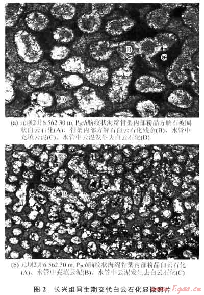 1) 長興組頂部同生期混合水白云巖的下部地層溶蝕作用較強,溶蝕孔隙發(fā)育,可能是同生期混合水白云巖多為粉晶白云巖,原始孔隙不發(fā)育,未給后期溶蝕創(chuàng)造條件,而其下部的埋藏白云石化形成的白云巖晶粒相對較粗,易于溶蝕,形成了較好的儲集巖。