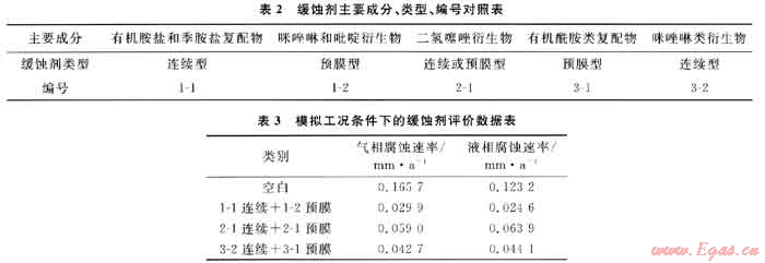 針對(duì)國外高含硫氣田已成熟應(yīng)用的商業(yè)產(chǎn)品,結(jié)合普光氣田濕氣集輸工藝的腐蝕特點(diǎn),選取了連續(xù)型和預(yù)膜型2種類型緩蝕劑。根據(jù)緩蝕劑在高含硫介質(zhì)條件下的成膜特性,優(yōu)選了有機(jī)胺鹽和季胺鹽復(fù)配物、咪唑啉和吡啶衍生物、二氫噻唑衍生物、有機(jī)酰胺類復(fù)配物、咪唑啉類衍生物共5類緩蝕劑產(chǎn)品,具體類型見表2。