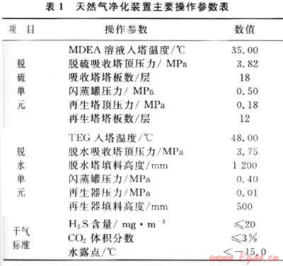川渝地區(qū)某50×104m3/d天然氣凈化裝置采用典型的甲基二乙醇胺(MDEA)溶液吸收法脫除原料氣中的酸氣(主要為H2S和C02)成分,用三甘醇(TEG)溶液吸收法脫除水分,降低天然氣的露點(diǎn)。原料氣的組成為:CH4體積分?jǐn)?shù)為95.100%,C2H6體積分?jǐn)?shù)為2.122%,C3H8體積分?jǐn)?shù)為0.431%,C4H10體積分?jǐn)?shù)為0.123%,C5H12體積分?jǐn)?shù)為0.032%,C02體積分?jǐn)?shù)為0.180%,H2S體積分?jǐn)?shù)為1.900%,N2體積分?jǐn)?shù)為0.112%,H2O為飽和狀態(tài)。圖1為該天然氣凈化裝置的工藝流程簡(jiǎn)圖。表1為該天然氣凈化裝置的主要操作參數(shù)及干氣質(zhì)量標(biāo)準(zhǔn)。