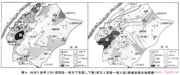 SLSC2層序基準(zhǔn)面下降期對(duì)應(yīng)須五上亞段及須六段沉積期,該時(shí)期屬于龍門山活動(dòng)相對(duì)寧?kù)o期,古地形相對(duì)變緩,沉積體系演變?yōu)橐匀侵?淺湖沉積為主,須五段早期的辮狀河三角洲向曲流河三角洲演變,湖盆中心位于彭山-射洪一線,呈北東向展布,明顯受古龍門山控制。三角洲前端淺湖砂壩及河口壩較湖盆擴(kuò)張期規(guī)模亦明顯變小,主要由龍門山前緣川西坳陷北段安縣-中壩地區(qū),米倉(cāng)山-大巴山前萬(wàn)源-宣漢、川東南川-重慶、川南宜賓-威遠(yuǎn)地區(qū)提供物源并發(fā)育規(guī)模相對(duì)較小的三角洲沉積。受晚印支運(yùn)動(dòng)影響,盆地北部安縣-劍閣一帶須五段沉積后隆升剝蝕缺失,須六段無(wú)沉積。