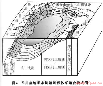 沖積扇-河流(沖積平原)-曲流河或辮狀河三角洲-湖泊沉積模式是四川盆地上三疊統(tǒng)的主體沉積樣式。以龍門山及米倉(cāng)山-大巴山為主的沖斷推覆構(gòu)造帶是前陸盆地主要物源區(qū),盆地邊緣廣泛發(fā)育沖積扇,并連接或疊覆構(gòu)成沖積扇群,逐漸過(guò)渡到河流、沖積平原,并在河流入湖處形成三角洲或辮狀河三角洲相沉積,在與物源相距較遠(yuǎn)、古地形比較平緩背景下形成曲流河三角洲,在造山帶前緣坡度較陡區(qū)域辮狀河入湖形成辮狀河三角洲,后者主要位于須四段上部。