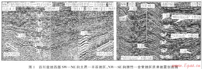 受資料限制,多數(shù)學(xué)者沉積相分析主要來(lái)自于地表露頭及鉆井資料,地震層序分析是獲得本文不同于前期地質(zhì)認(rèn)識(shí)的重要依據(jù),主要線索包括地震剖面上地層厚度變化關(guān)系、層間接觸關(guān)系,層段內(nèi)砂體或砂層組分布及疊加樣式等。主要選取了與龍門山或川西坳陷平行、垂直的NE向和NW 向區(qū)域二三維地震剖面進(jìn)行層序格架與砂體疊加樣式分析。